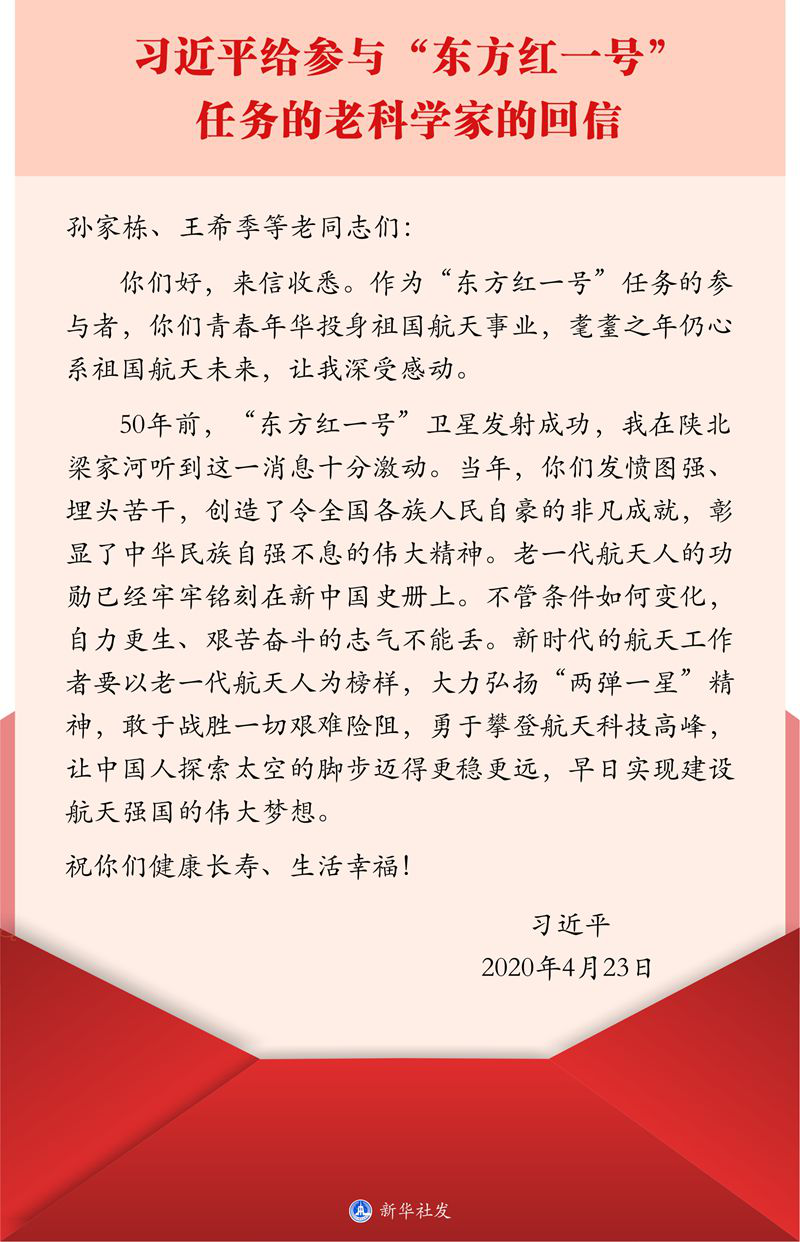50年前,“东方红一号”卫星发射成功,我在陕北梁家河听到这一消息十分激动。当年,你们发愤图强、埋头苦干,创造了令全国各族人民自豪的非凡成就,彰显了中华民族自强不息的伟大精神。老一代航天人的功勋已经牢牢铭刻在新中国史册上。不管条件如何变化,自力更生、艰苦奋斗的志气不能丢。新时代的航天工作者要以老一代航天人为榜样,大力弘扬“两弹一星”精神,敢于战胜一切艰难险阻,勇于攀登航天科技高峰,让中国人探索太空的脚步迈得更稳更远,早日实现建设航天强国的伟大梦想。