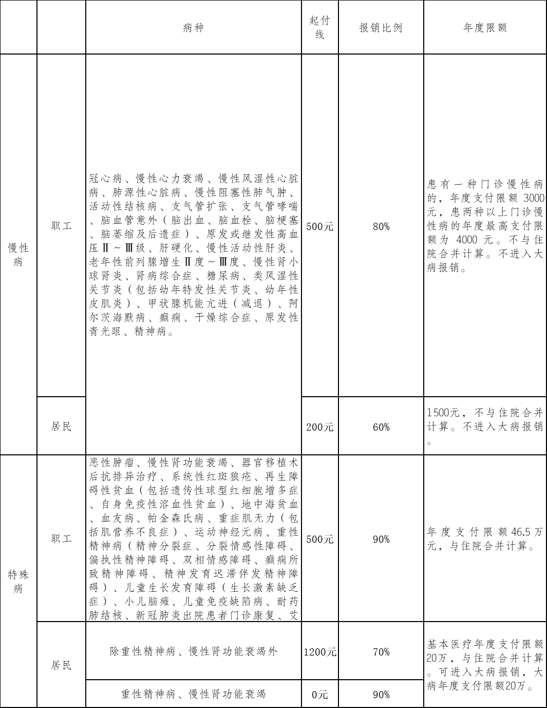 3、支付限额:普通门诊费用统筹基金年度最高支付限额为 5000 元,与年度住院最高支付限额分别计算。超过 5000 元的普通门诊政策范围内费用,按照就诊医疗机构职工医保住院统筹基金支付比例报销,与年度住院最高支付限额合并计算。