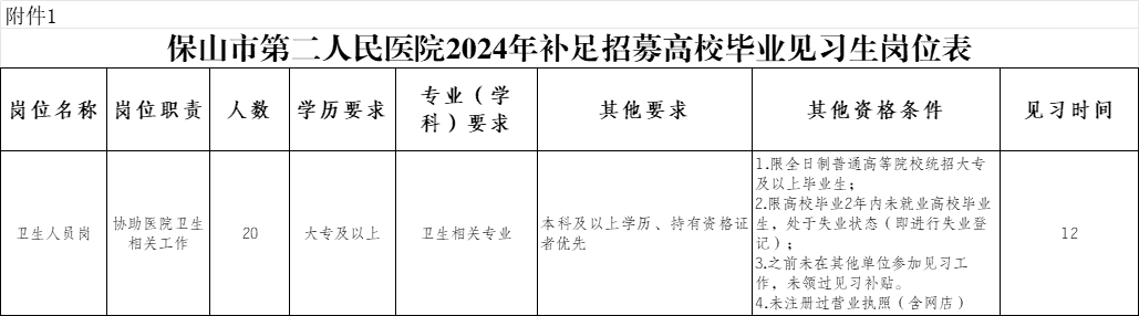 本次招募岗位为保山市第二人民医院高校毕业见习生,招募人数20人,岗位为“卫生人员岗”,岗位具体要求详见《保山市第二人民医院2024年度补足招募高校毕业见习生公开招募岗位表》。