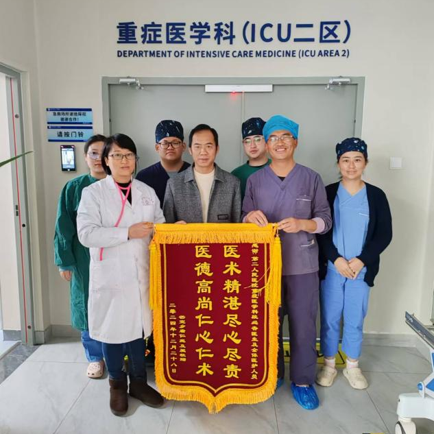 12月28日,刚刚从死神手中夺回生命的唐先生,在其家属的陪同下,为科室送来了充满感激之情的锦旗。锦旗上写着:“医术精湛,尽心尽责,医德高尚,仁心仁术”,这不仅是对重症医学科全体医护人员工作的高度认可,也是对医院服务理念的最佳诠释。