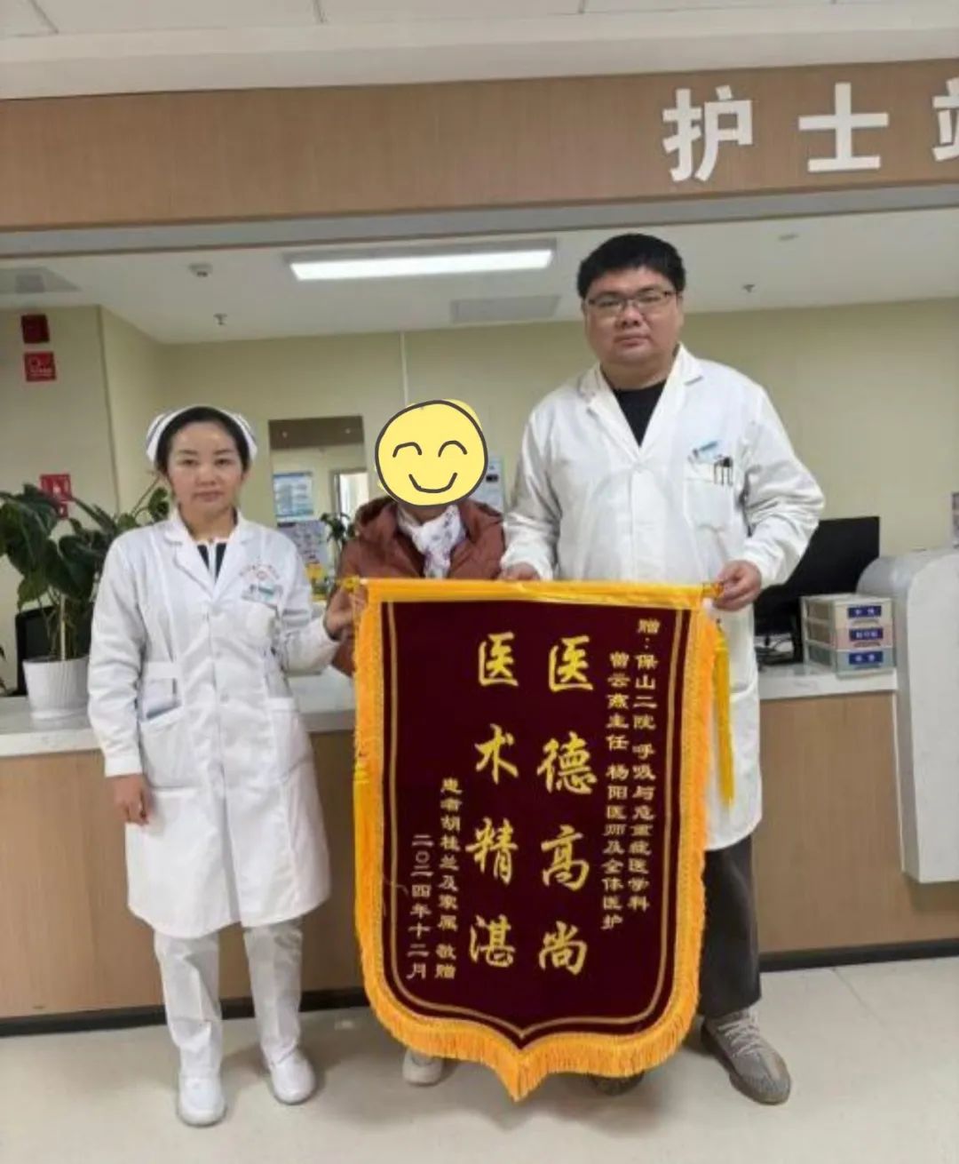 近日,顺利康复后的胡奶奶在家人的陪伴下,将最真挚的感谢—一面沉甸甸的锦旗送到呼吸与危重症医学科医护团队和胸外科医护团队的手中。这不仅仅是一份荣誉,更是对我院医护人员辛勤付出与专业精神的最高赞誉。