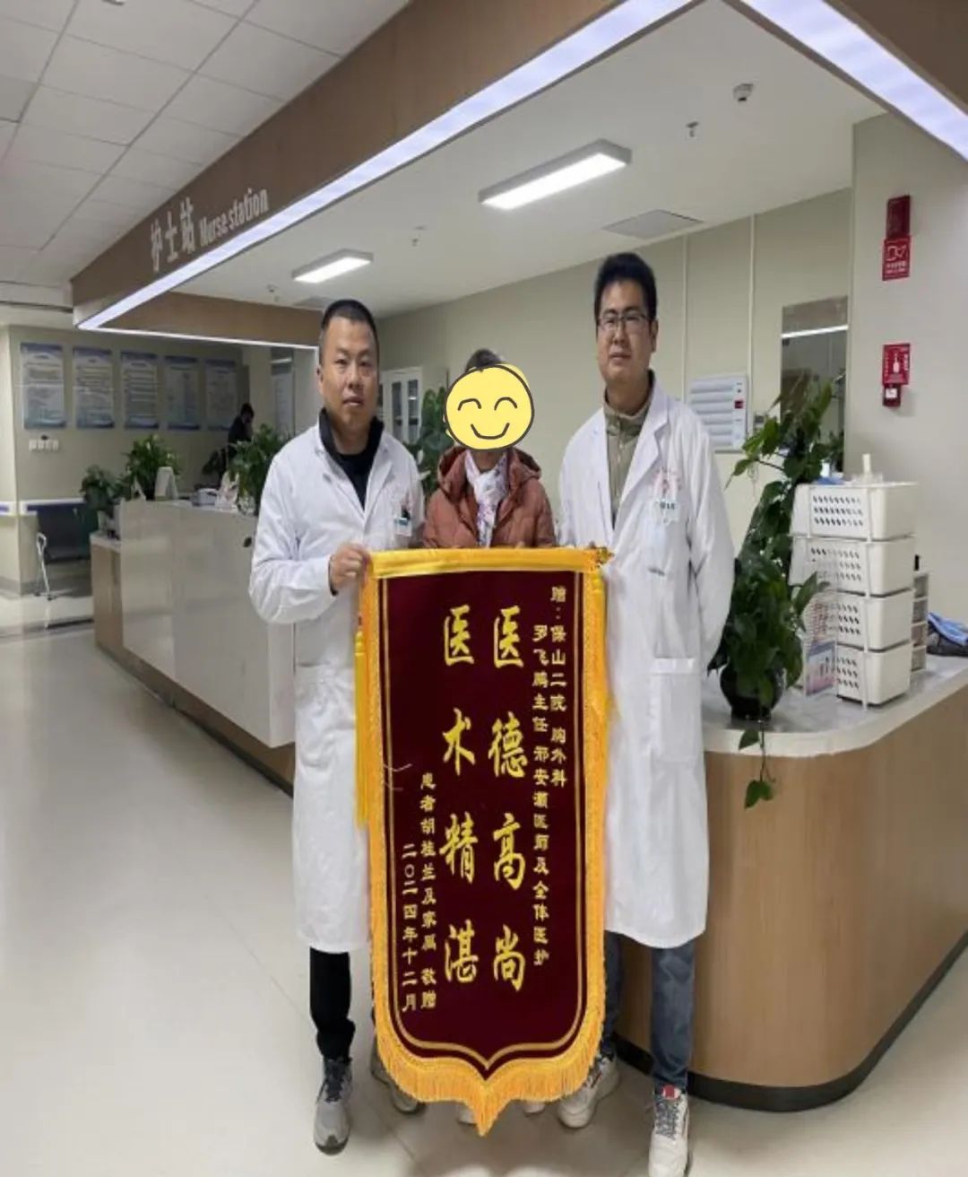 康复后,胡阿姨及家属对我院医护团队精湛的医疗技术、热情耐心的服务给予了高度评价,特送来锦旗表达感谢。
