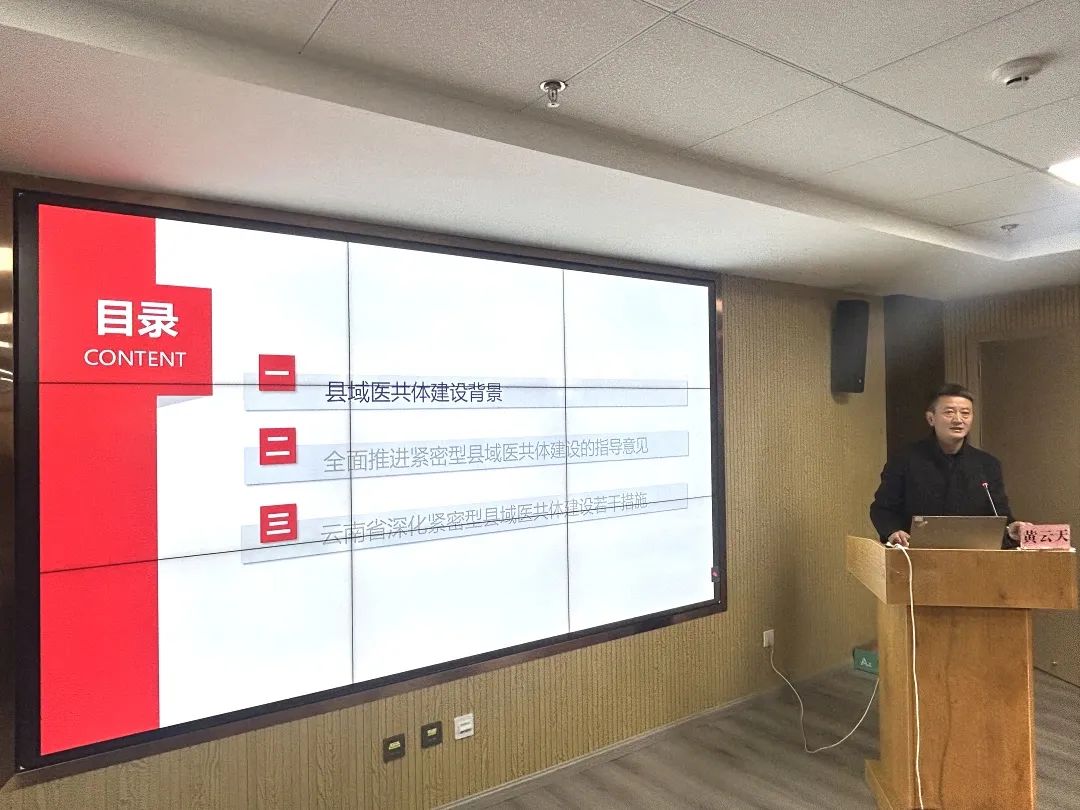 1月22日,隆阳区紧密型医疗卫生共同体政策解读培训暨2024年度运行分析会在医共体总院(保山市二院)召开。市卫健委领,区卫健局领导及相关股室负责人,总院领导及相关科室主任,医共体成员单位院长(主任)及52名第四批下派帮扶医务人员参加会议。会议由隆阳区卫生健康局副局长、紧密型医共体理事长、总院院长何丽芬主持。