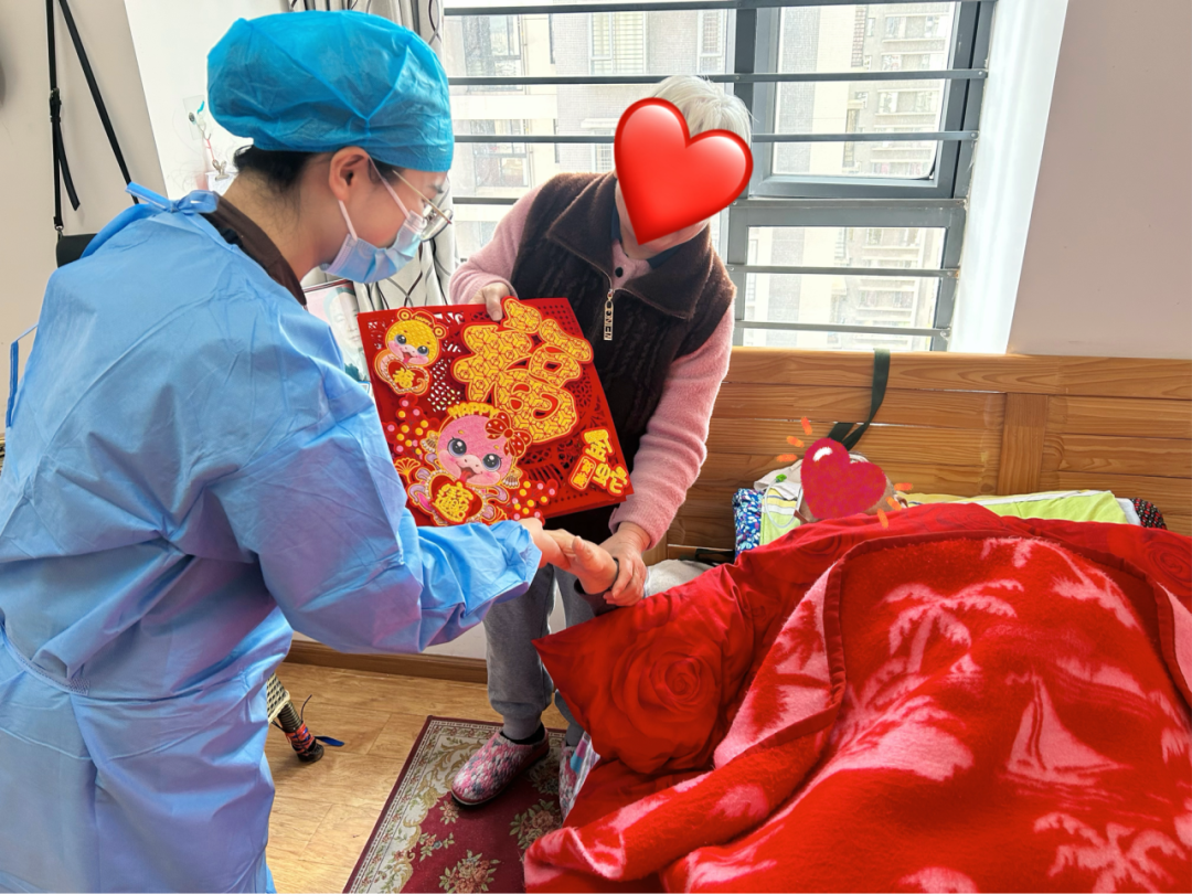 近日,邱奶奶下单了我院“互联网+护理服务”,泌尿外科的护理人员也应着春节的来临,给邱奶奶家送上了节日的祝福,邱奶奶甚是感动。她说“崔爷爷长期卧床,不能移动,不能自理,全凭我一个人照顾,以前每次更换尿管都很头疼,年纪大了,搬不动,必须打120急救电话,让救护车送到医院才可以更换,现在好了,有了‘互联网+护理服务’,手机上下单,就有专业的护理人员上门服务,我们老年人不会下单,拨打电话,医护人员就能协助下单,彻底解决了我们的烦恼,省时、省力、更省心。”