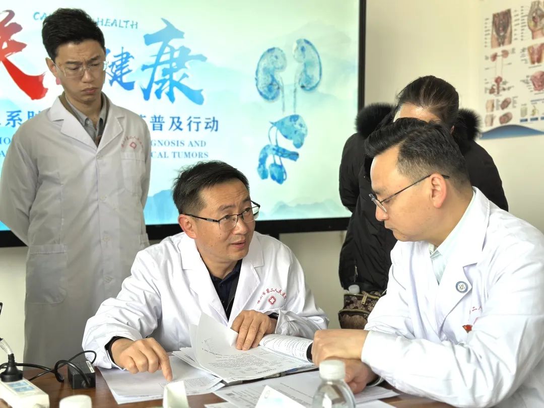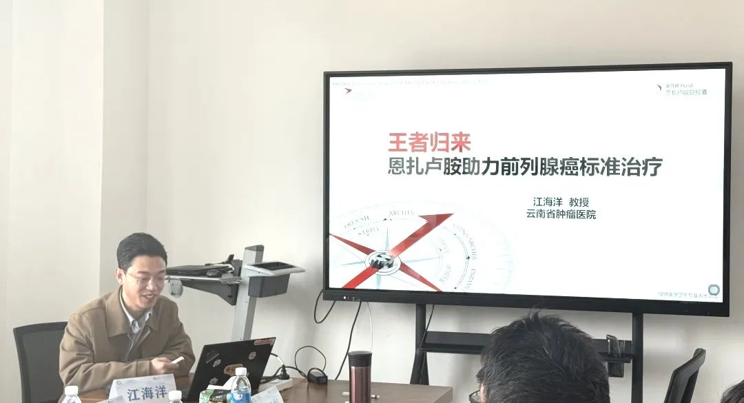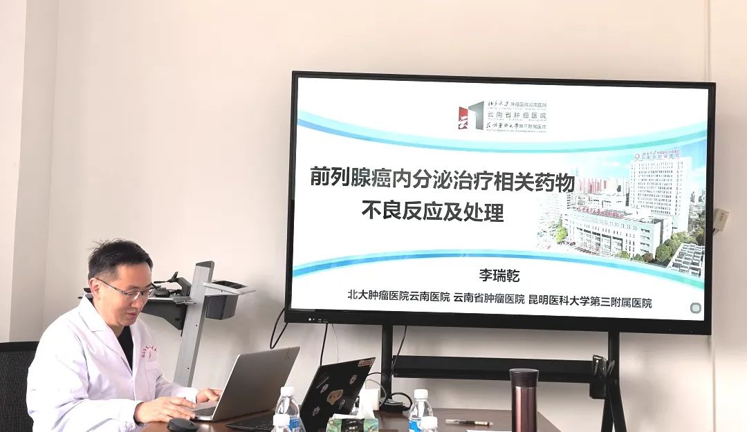 当天,李教授专家团队共为20余位患者提供医疗服务。针对我院收治的3例高风险癌症病例,李教授专家团队与我院泌尿外科团队深入研讨,优化治疗方案,现场查房指导。此外,李瑞乾教授与江海洋教授围绕“前列腺癌内分泌治疗相关药物不良反应及处理”“恩扎卢胺助力前列腺癌标准治疗”两个主题,为泌尿外科医护团队带来前沿学术分享。
