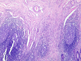 多由急性或亚急性阑尾炎发展而来,亦可一开始就是慢性炎,主要病变为阑尾各层不同程度纤维化和淋巴细胞、浆细胞浸润。