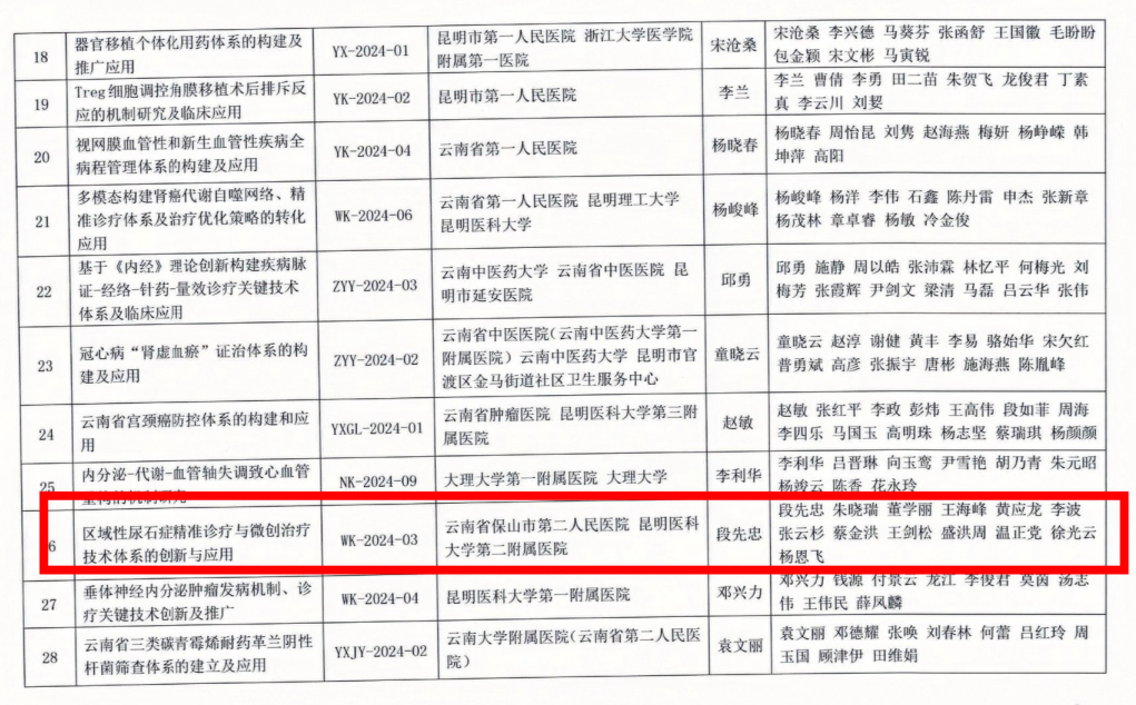 近日,云南省卫生科技教育协会公布了2024年度云南省卫生科技成果奖获奖名单,我院泌尿外科团队凭借《区域性尿石症精准诊疗与微创治疗技术体系的创新与应用》荣获三等奖。