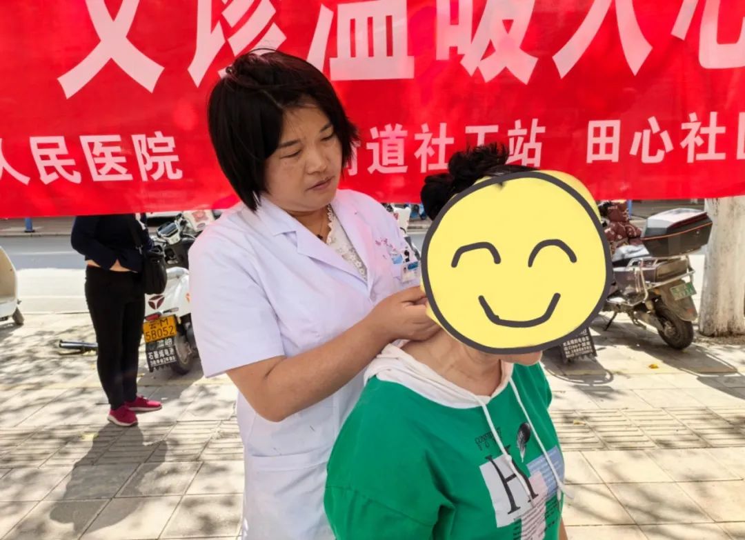 5月的田心社区广场上,党徽、白大褂与红马甲交相辉映。身着白大褂的医生们正忙碌地为居民量血压、问诊把脉,身穿红马甲的志愿者穿梭其间,递资料、引方向。