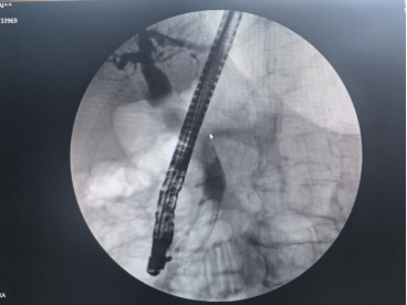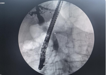 用经口电子胆管内窥镜进入胆管探查后,未探及明显隆起及肿物,考虑胆管下段炎性狭窄,拟留置覆膜胆道支架3月后返院复诊拔除支架。