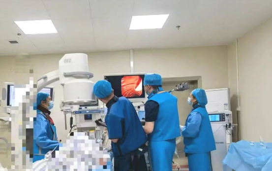 在吴文广教授的指导下,团队成功为一名56岁的胰腺癌患者实施了ERCP手术。检查提示“胰腺头颈部恶性肿瘤伴肝内外胆管及胰腺体尾部主胰管扩张”,针对患者病情,吴文广教授带领团队在术前展开充分讨论,制订了缜密的治疗方案,在与患者及家属充分沟通后最终决定通过内镜下放置胆管支架、胰管支架,为患者解除梗阻。术中,在吴文广教授的指导下,杨晨组长带领团队经预切开、插管、造影、支架置入等一系列操作,团队成功解除了胆道梗阻,最终成功引流出黑色胆汁,手术取得成功。