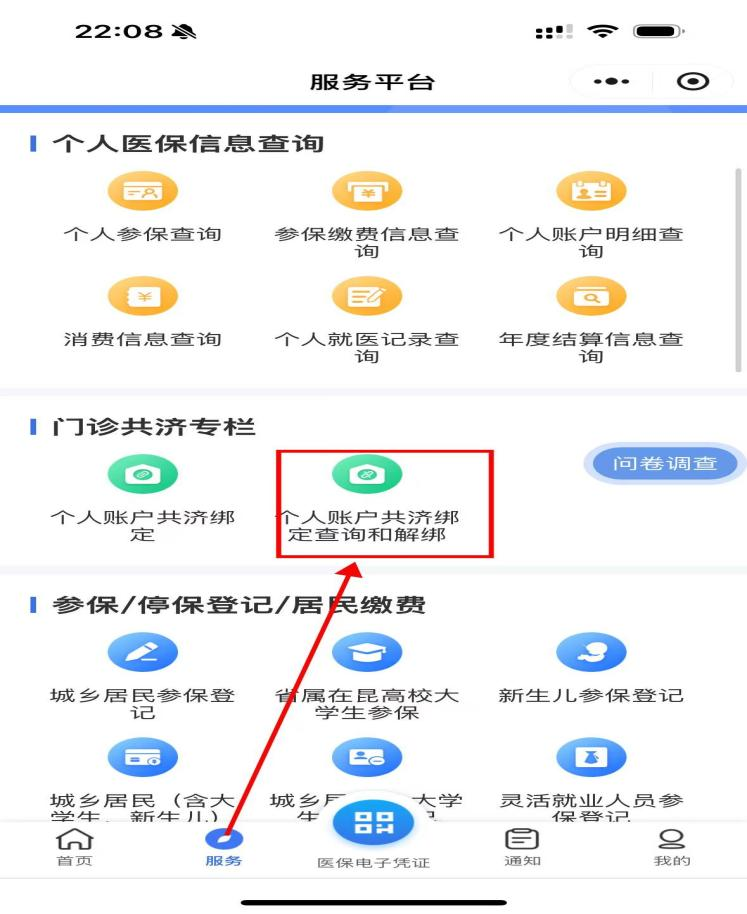 第四步检查是否绑定成功。点击服务,然后点击“个人账户共济绑定查询和解绑”查看绑定记录。