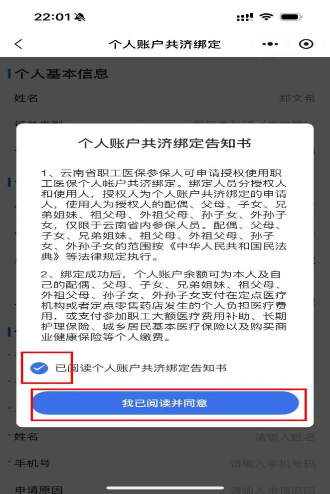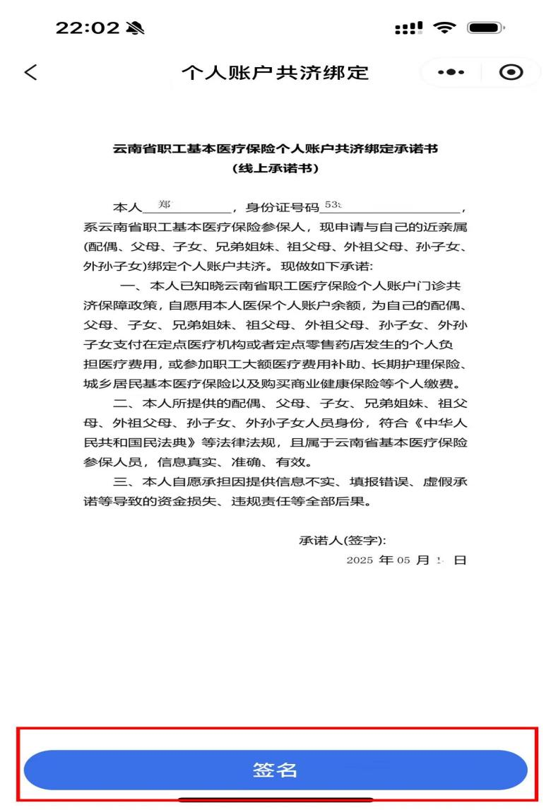 第三步,在首页找到个人账户共济绑定,点击已阅读个人账户共济当定告知书,再点击我已阅读并同意,然后填写使用人的证件号、与授权人关系、姓名、手机号、申请原因,点击生成承诺书,签名后点击【提交】。