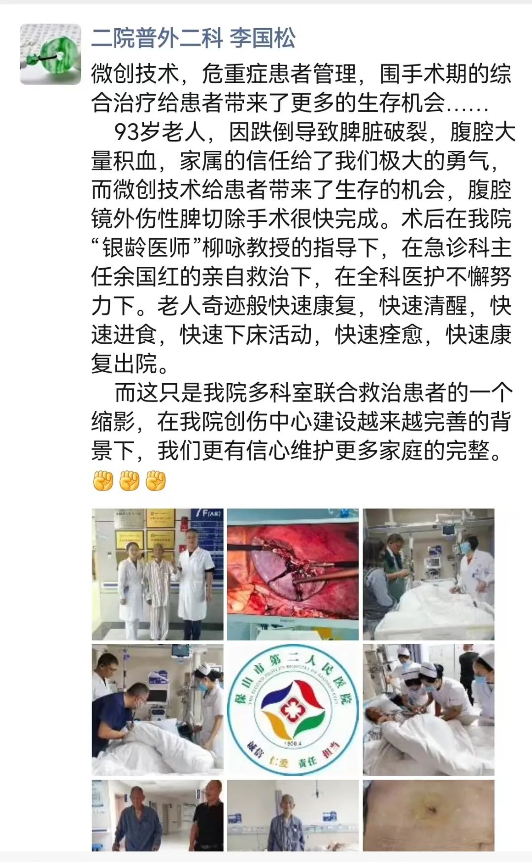 93岁超高龄不再是手术“禁区”!老人家因外伤导致脾破裂,在医院多学科团队(MDT)的紧密协作下,李国松主任以娴熟的微创技术、加之来自江苏常州的“银龄医师”柳咏教授的全程指导,不仅挽救了患者生命,更实现了术后12天快速康复出院!