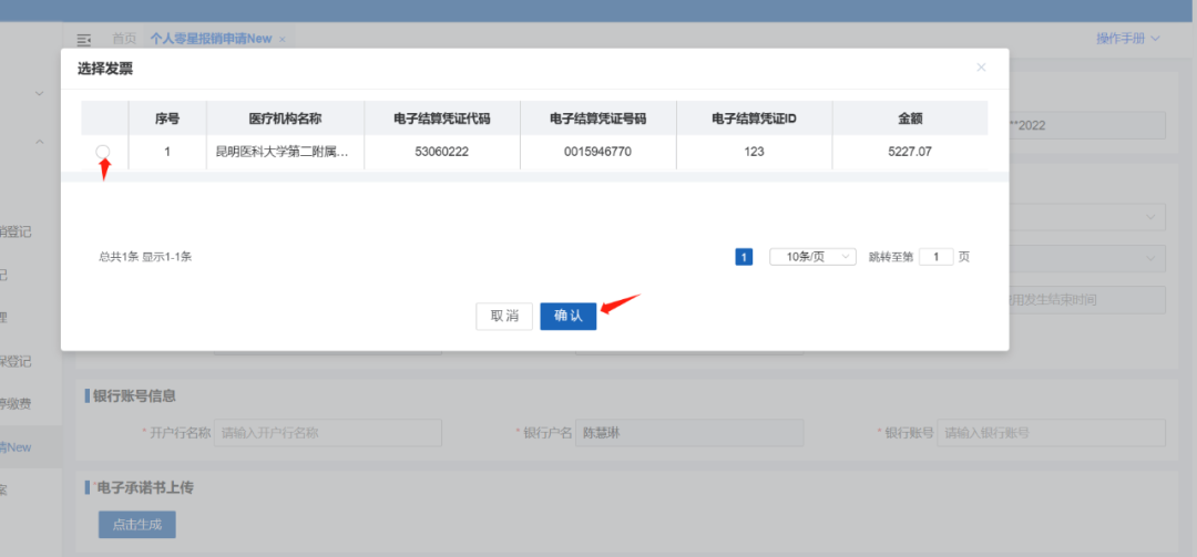 ★根据网页表单,选择【待报销明细】,输入带*的必填项,上传证明材料,然后点击提交。
