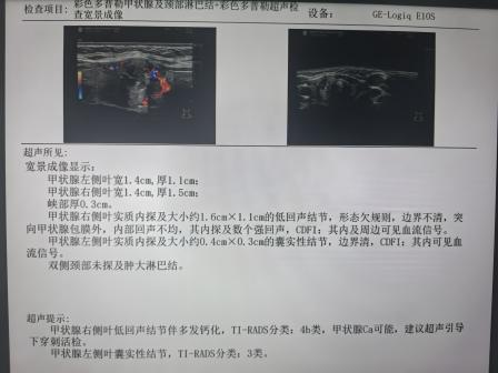 甲状腺超声提示:甲状腺右侧叶低回声结节伴多发钙化,TI-RADS分类:4b类,甲状腺癌可能。