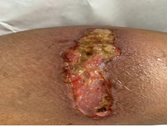 73岁男性患者,右小腿因排气管烫伤,不引起重视,自行简单处理后,虽然表面结痂,但痂下有感染,采用湿性愈合理念换药,经过换药全部治愈。