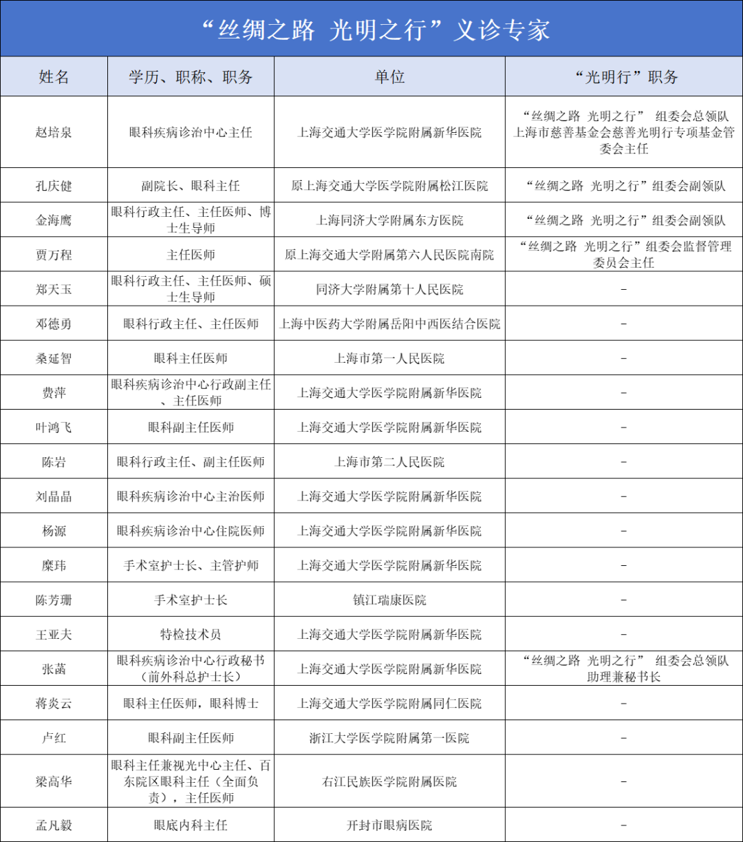 “丝绸之路 光明之行”组委会副领队,原上海交通大学医学院附属松江医院副院长、眼科主任