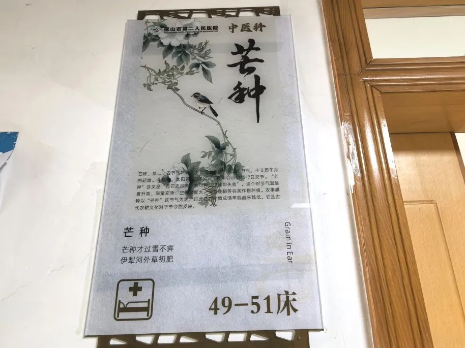 2025年7月,保山市二院中医科完成病房及病区文化升级,将二十四节气文化内涵与中医药特色诊疗体系深度融合,每间病房以节气命名并配以对应书画作品,“谷雨”病房的水墨江南、“立冬”病房的傲雪红梅等主题设计,在传承中医药文化的同时构建起充满治愈感的人文空间。