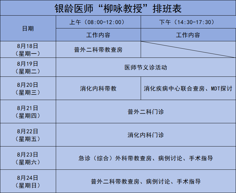 “银龄医师”柳咏教授排班表