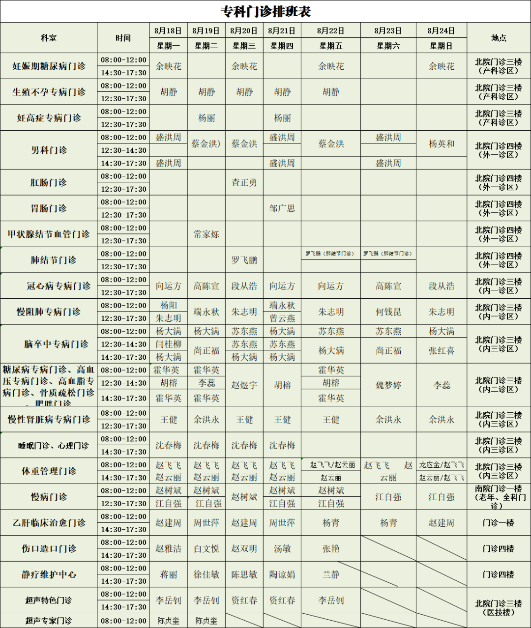 必收藏︱保山市二院新、老院区8月18日—8月24日门诊出诊表
