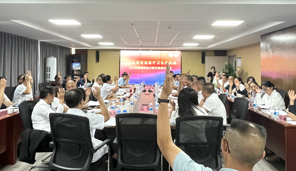 经理事会讨论决定对事项进行表决,全票通过《隆阳区紧密型医疗卫生共同体2025年城乡居民基本医疗保险总额控制打包付费实施方案二》。