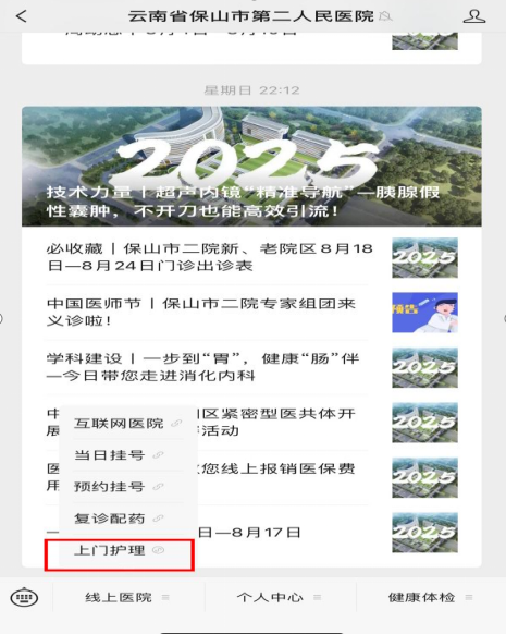 打开手机微信搜索公众号“云南省保山市第二人民医院”,服务对象主要为在本院就诊过的人群,以新院区为中心点半径为15公里以内的区域方可下单