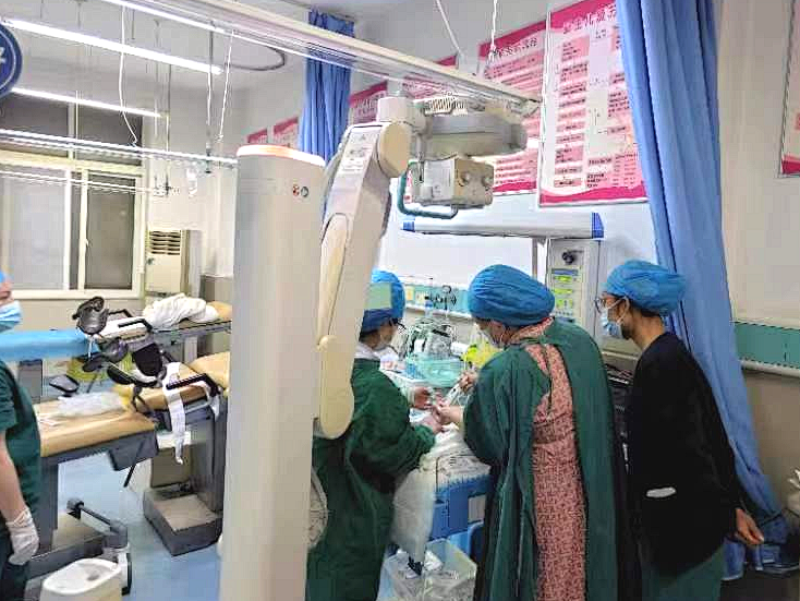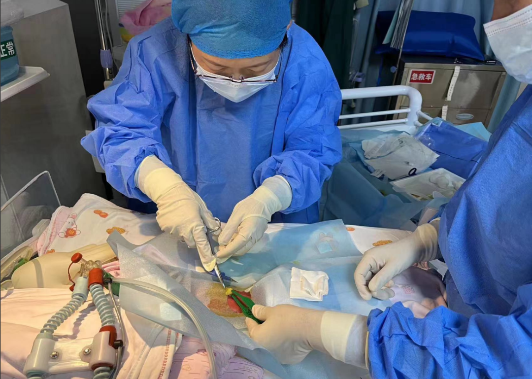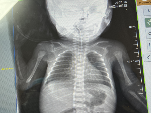宝宝出生瞬间,产房内急救随即启动。医护人员第一时间完成胸部X线检查,精准评估肺部情况,并迅速通过气管内注入肺表面活性物质,为脆弱的呼吸功能筑起第一道“防护墙”。