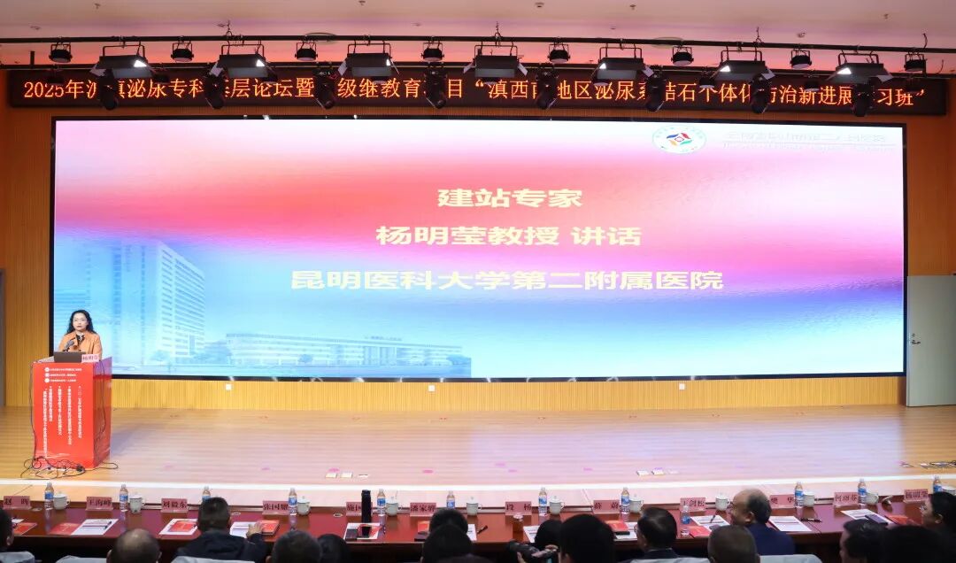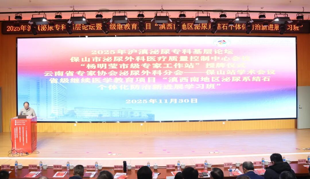 11月30日,2025年沪滇泌尿专科基层论坛、保山市泌尿外科医疗质量控制中心会议、杨明莹市级专家工作站授牌仪式、云南省专家协会泌尿外科分会一保山站学术会议及省级继续医学教育项目“滇西南地区泌尿系结石个体化防治新进展学习班”在我院举办。在大会名誉主席上海交通大学医学院附属仁济医院薛蔚教授,昆明医科大学第二附属医院王剑松教授,大会主席保山市第二人民医院段先忠的邀请下,潘家骅教授,刘毅东教授、施国伟教授、樊华教授、宋乐明教授、王海峰教授、杨明莹教授等多位省内外专家到院授课并指导带教。来自保山市及周边各级医院、隆阳区紧密型医共体总院及各分院相关专业医护人员参会。会议由区卫健局副局长、保山市二院党委书记严治成主持。