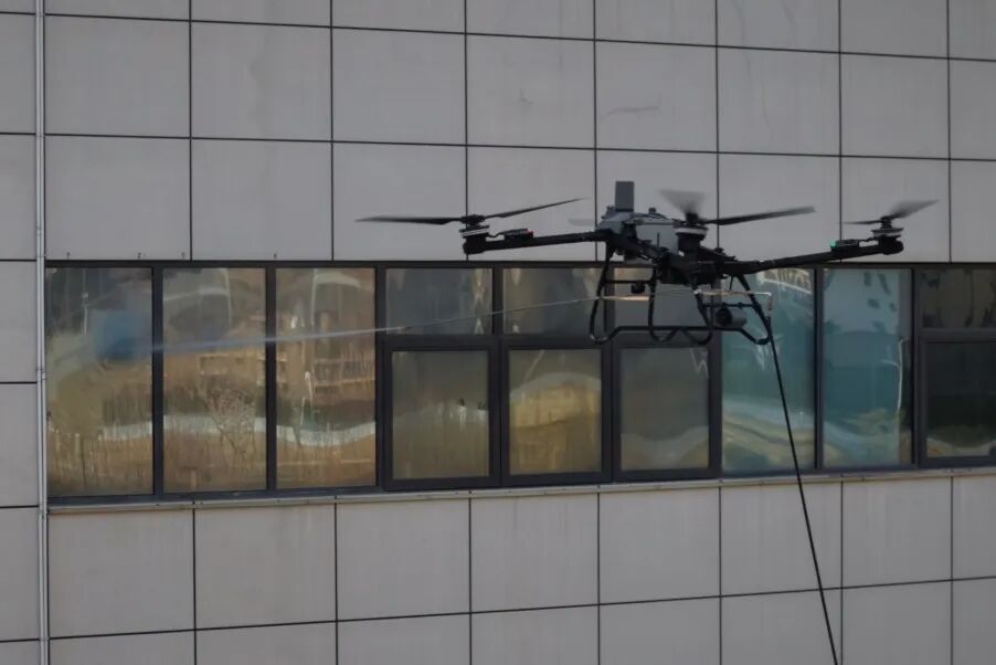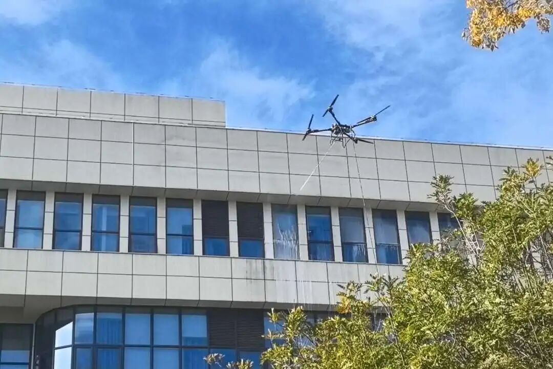 作业前,我院后勤团队系统评估建筑结构、周边环境及作业条件,制定详细清洗方案与应急预案,确保全过程可控可追溯。作业中,无人机凭借精准定位、稳定悬停优势,通过地面系留供电持续作业,搭配专用清洁剂实现幕墙全面清洗,最终洁净透亮无明显水渍,实现了院内医疗秩序“零干扰”。