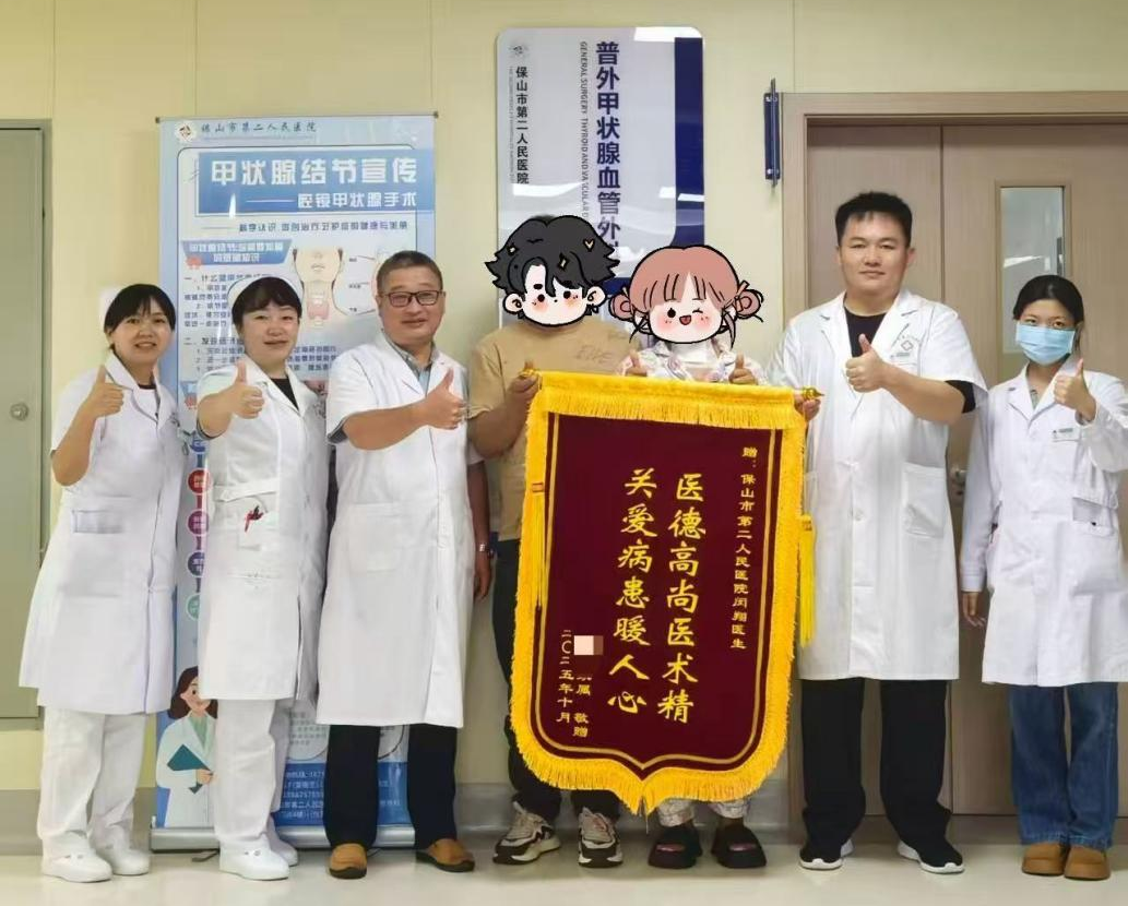 近日,我院普外甲状腺、血管外科收到一面饱含深情的锦旗——“医德高尚医术精、关爱病患暖人心”。这不仅凝聚着患者及其家属的诚挚谢意,也见证了科室在甲状腺疾病诊疗领域的专业实力与人文温度。