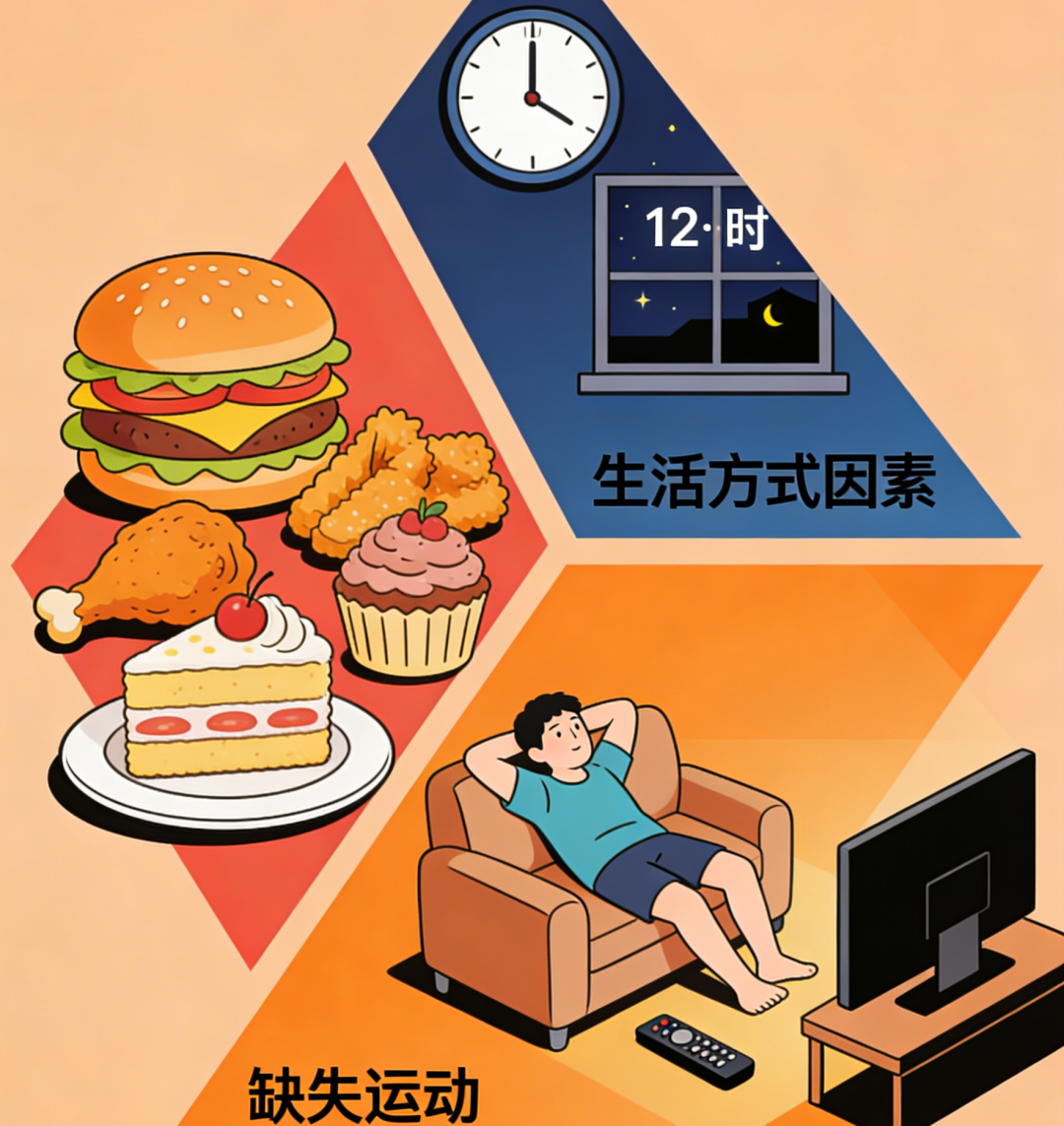 ★生活方式因素:这是肥胖最主要的诱因,包括长期摄入高热量、高油、高糖、高盐食物,三餐不规律、暴饮暴食,以及缺乏运动、久坐、长期熬夜等不良习惯。