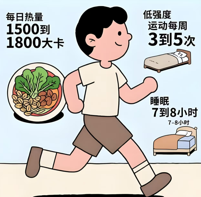 ★营养均衡是关键:三餐规律,减少高油、高糖、高盐食物和精加工食品(如糕点、油炸食品)的摄入;增加蔬菜、水果、全谷物和优质蛋白质(如鱼、虾、鸡胸肉、豆制品)的比例;控制总热量摄入,每日保持1500~1800大卡,避免暴饮暴食。