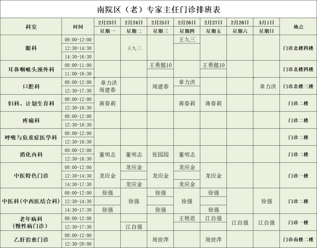 南院区专家主任门诊排班表