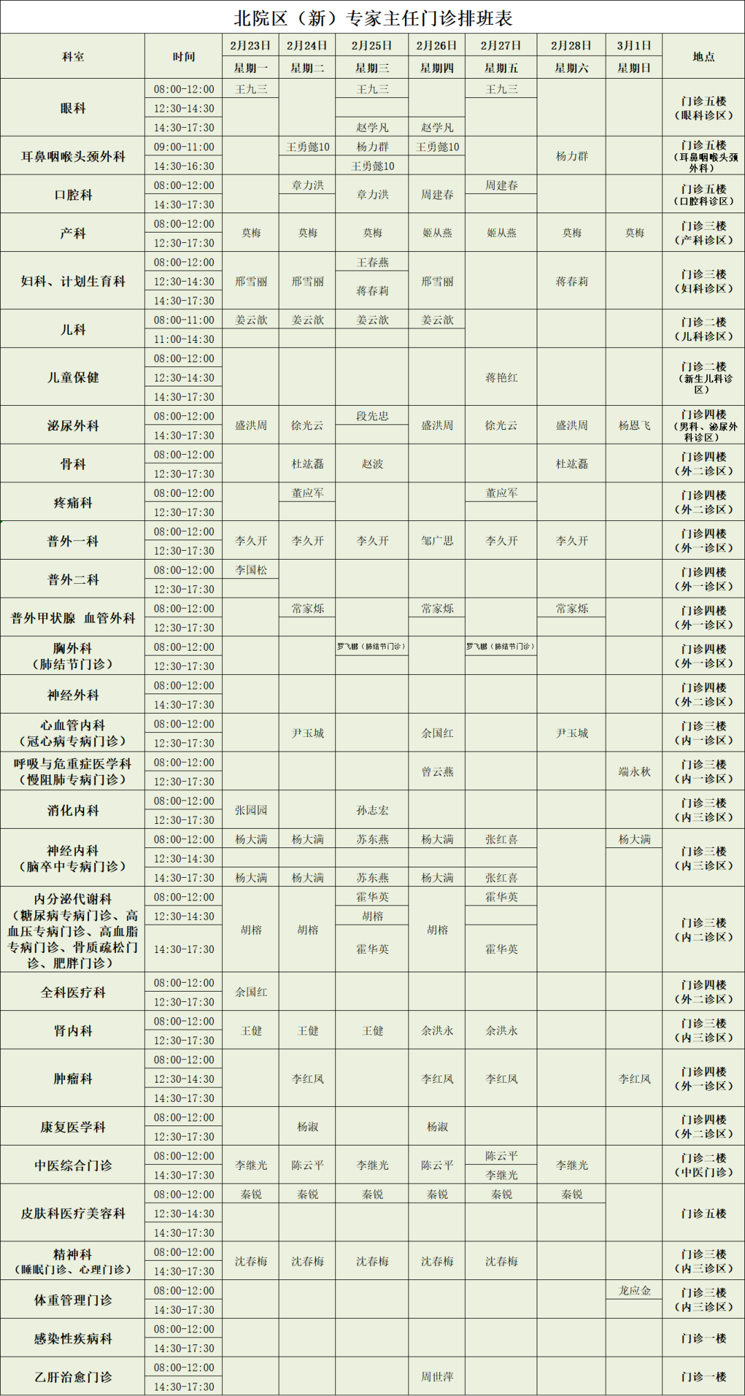 北院区专家主任门诊排班表
