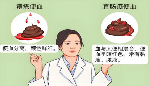 ★颜色不同: 痔疮出血通常是大便表面带血,颜色鲜红,滴血或喷射状出血。而直肠癌的出血通常是暗红色或果酱色的血,有时与大便混合在一起,还可能带有粘液或脓液。